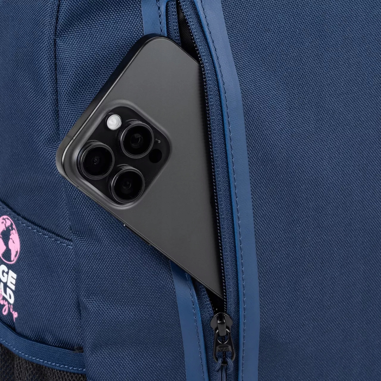 Plecak jest utrzymany w eleganckim, ciemnoniebieskim kolorze i stylowo wykończony różowymi akcentami na zamkach i szwach.